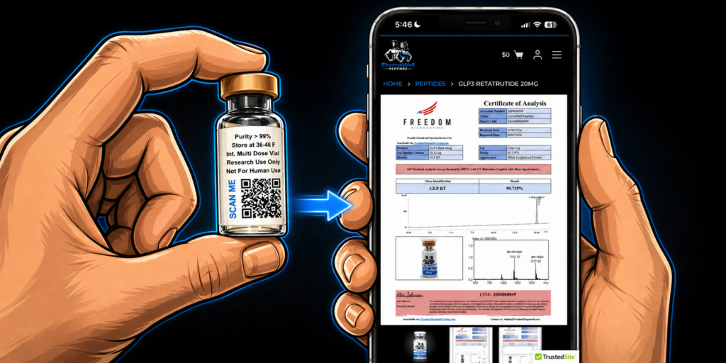 For quick and convenient verification of COAs, every single EternaWell peptide vial contains a scannable QR code for that product. We believe every customer deserves quick and convenient access to verify the quality of their product.